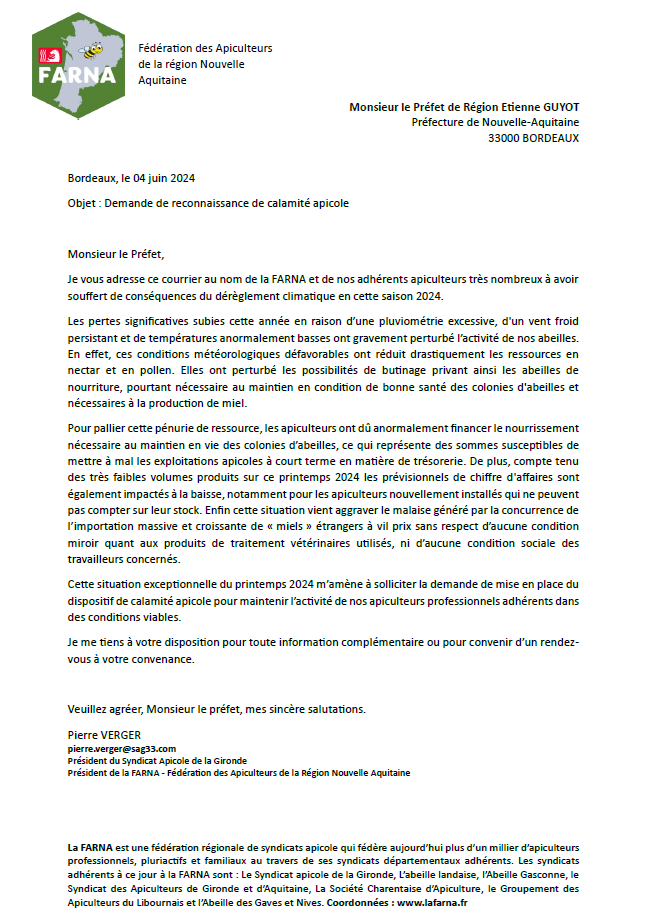 Compte-tenu des conditions climatiques exécrables de ce printemps 2024, le SAG a pris l’initiative et proposé à la FARNA de rédiger un courrier à la préfecture de Région Nouvelle Aquitaine afin de demander l’activation d’un dispositif de calamité apicole. En effet, des pluies excessives, des températures anormalement basses, un vent froid persistant et des floraisons enregistrant environ 15 jours d’avance, n’ont pas permis aux abeilles d’aller à la rencontre du nectar et du pollen pourtant nécessaire à leur maintien dans des conditions saines de vie, ainsi qu’à la production du miel.